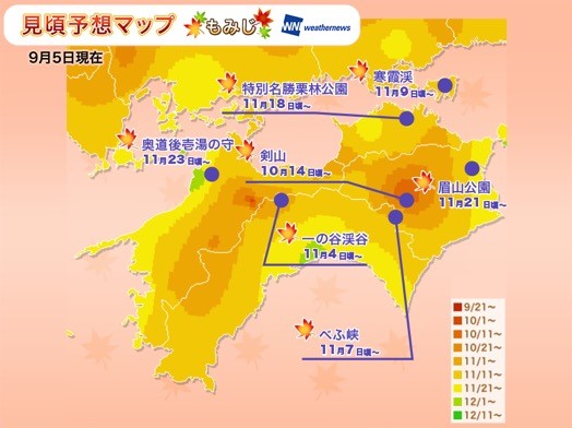 九州地區的楓葉季預計會和往常同樣時間,從10月底開始到11月都可以欣賞到絕美的楓葉景觀。