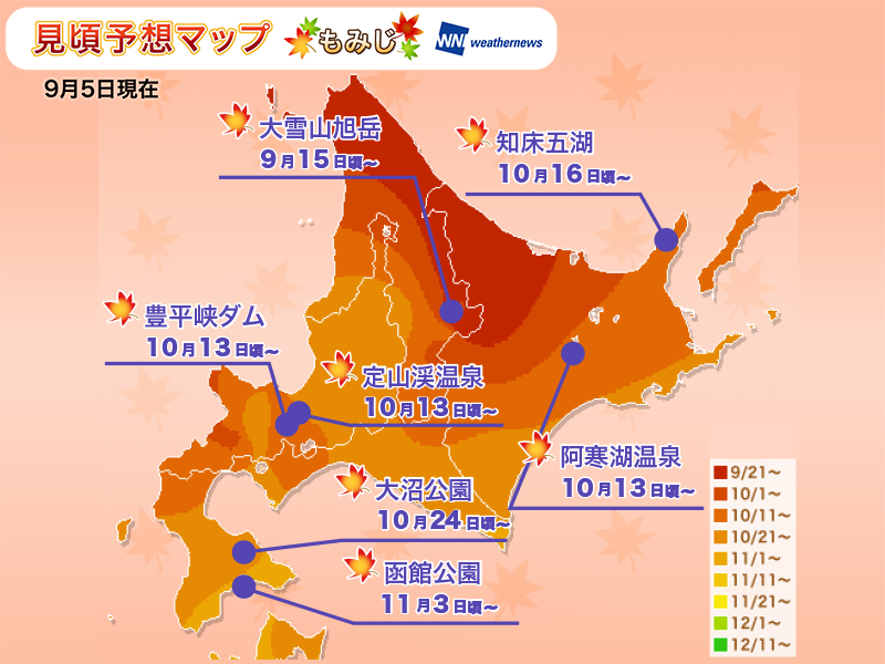 北海道預計比往年晚一點,但從9/15開始就可以看見楓紅了,是日本最早看楓葉的地區喔!