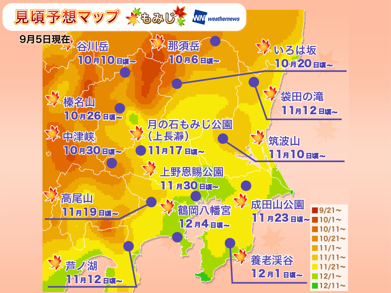 Weathernews預測關東地區比往年晚了4~7天,楓葉季從10月開始到12月初都有機會,可以參考預測的時間去看看喔!