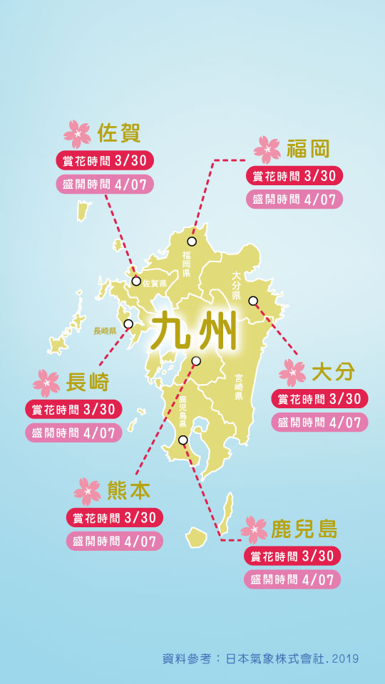 說到九州馬上想到超可愛的熊本熊啦!九州地區沒有關東及關西地區那麼繁華,多了一點樸實,可以悠閒地欣賞櫻花的美景,有機會還可以帶上野餐墊和一些可口的甜點,跟日本人一起在櫻花樹下野餐吧!