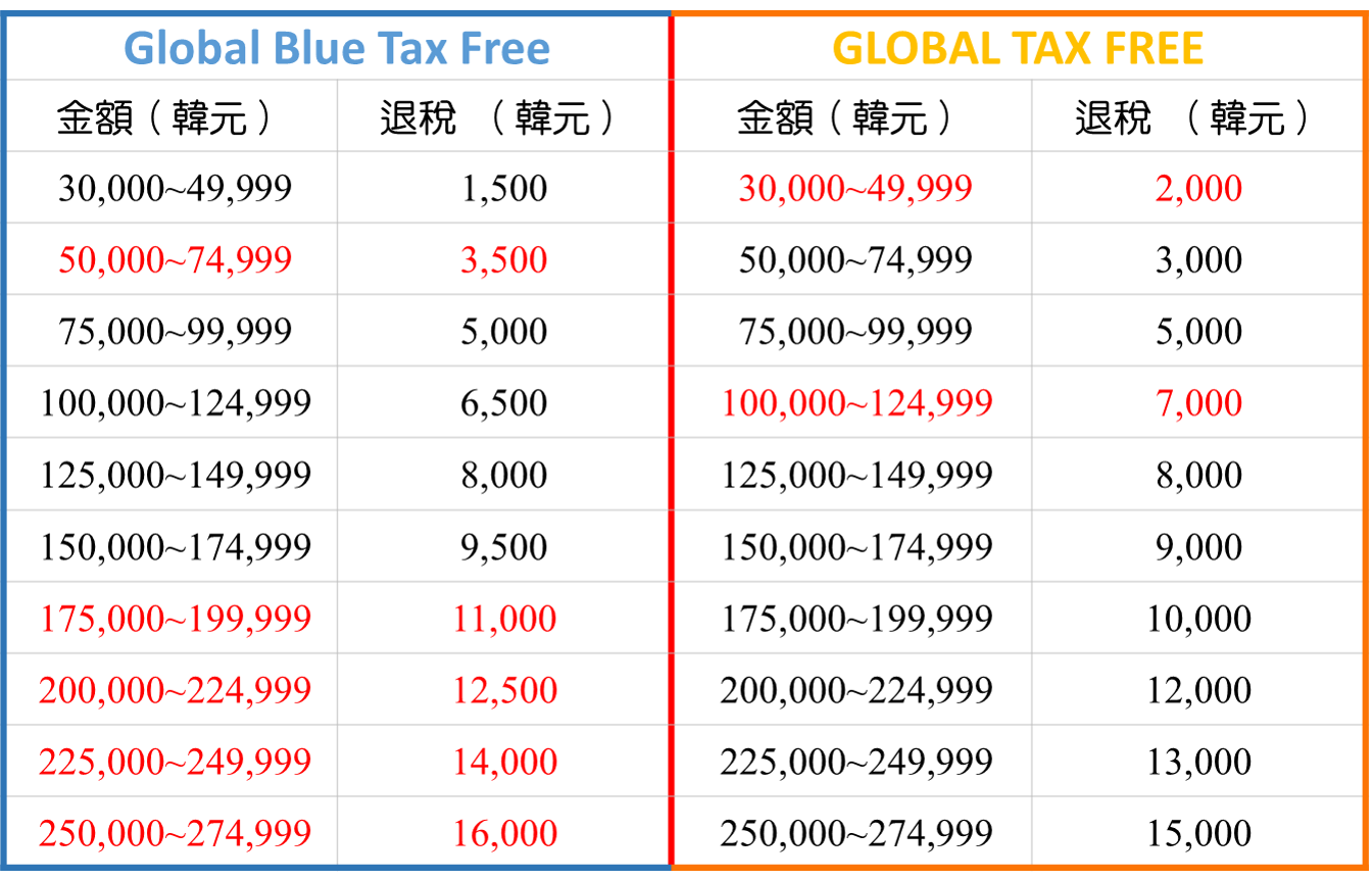 韓國退稅是按照級距做退稅,不同退稅公司也有不同的退稅金額,而基本要滿3萬韓元,超過一定金額就可以退更多的稅金喔!
